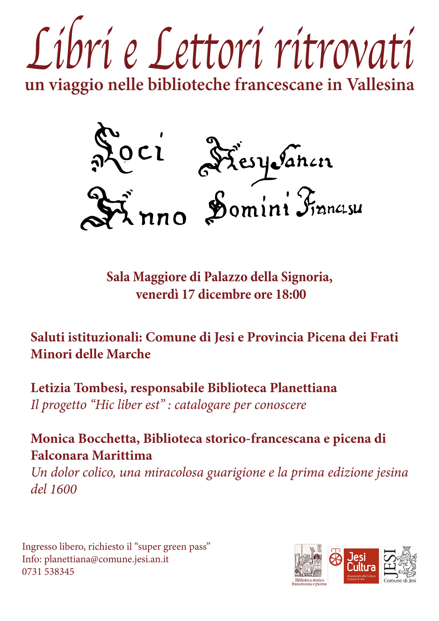 Venerdì 17 dicembre 2021, alle ore 18:00, presso la Sala Maggiore della Biblioteca Planettiana di Jesi, si terrà la conferenza dal titolo Libri e Lettori ritrovati. Un viaggio nelle biblioteche francescane in Vallesina. Al seguente link, è disponibile il programma dell’evento.